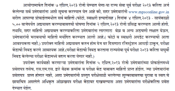 “All the candidates who have applied for the State Services Preliminary Examination 2013 to be held on 7th April,2013 are hereby requested to update (refill) their profile details (such as Photo,Signature etc.) by 17.00 hrs on Thursday 4th April,2013 on http://www.mpsconline.gov.in without which, the Admission Certificates shall not be issued. The Admission Certificates shall be issued on the next day of the profile updation.”