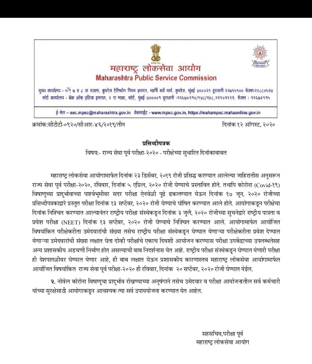 एमपीएससी राज्यसेवा पूर्व परीक्षा आता 13 ऐवजी 20 सप्टेंबर 2020 ला होणार आहे.