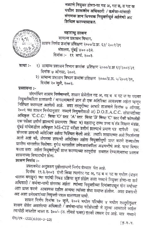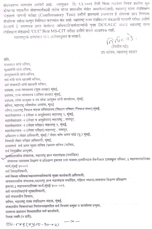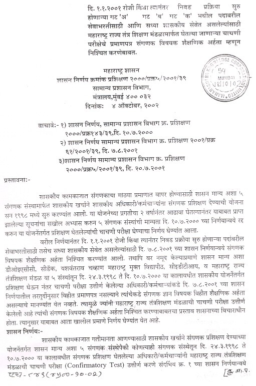 Here is the GR that was issued by Govt of Maharashtra about recognised academic Degrees/Certificates (like computer technology, computer engg, IT, computer application, ADCSSAA, etc). Click this: – gcom020801